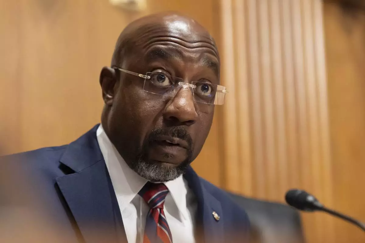 Sen. Raphael Warnock, D-Ga., speaks as Secretary of Health and Human Services Robert F. Kennedy Jr., appears before the Senate Finance Committee, on Capitol Hill in Washington, Thursday, Sept. 4, 2025. (AP Photo/Mark Schiefelbein)