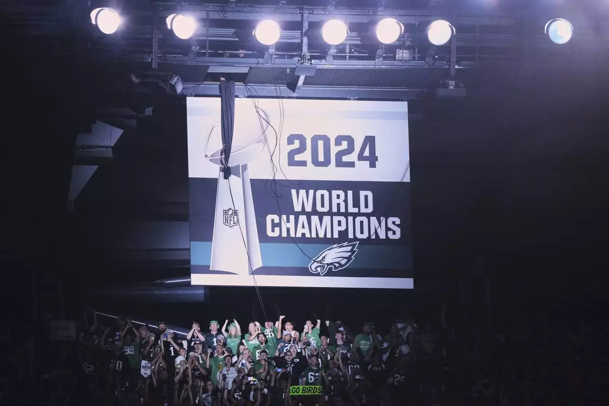 The Philadelphia Eagles 2024 championship banner is unveiled before an NFL football game against the Dallas Cowboys Thursday, Sept. 4, 2025, in Philadelphia. (AP Photo/Matt Slocum)