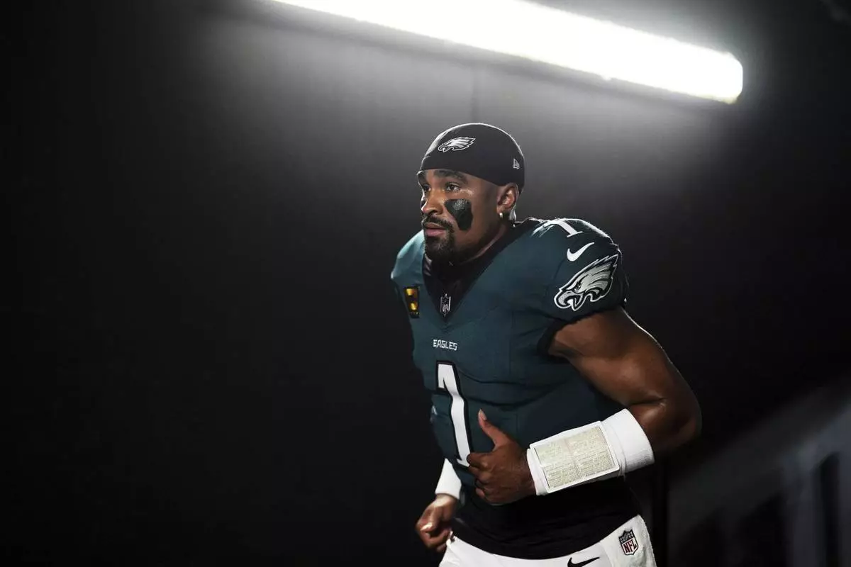 Philadelphia Eagles quarterback Jalen Hurts jogs down a tunnel before an NFL football game against the Dallas Cowboys Thursday, Sept. 4, 2025, in Philadelphia. (AP Photo/Matt Slocum)