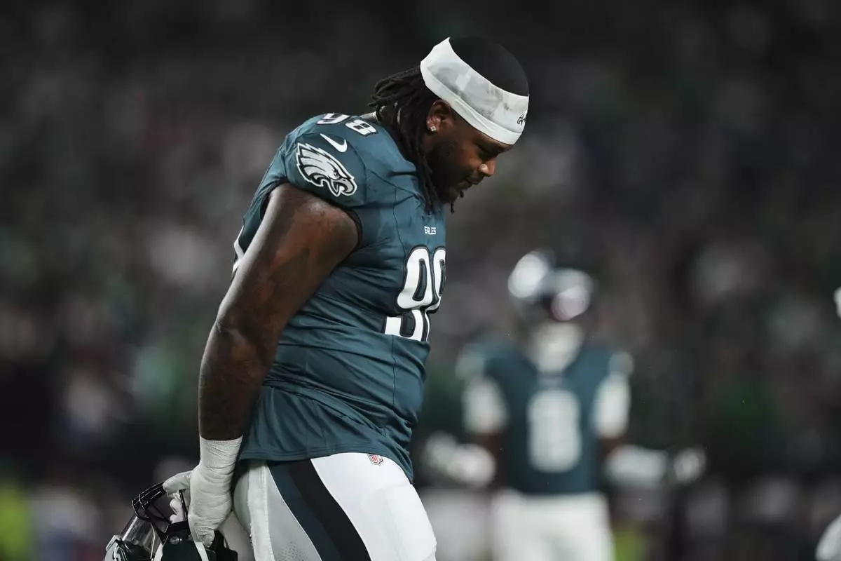 Philadelphia Eagles defensive tackle Jalen Carter walks off the field after being disqualified for unsportsman like conduct before an NFL football game against the Dallas Cowboys Thursday, Sept. 4, 2025, in Philadelphia. (AP Photo/Matt Slocum)