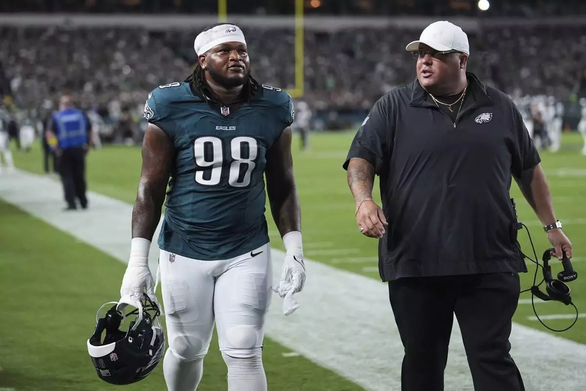 Philadelphia Eagles defensive tackle Jalen Carter (98) walks off the field after being disqualified for unsportsman like conduct before an NFL football game against the Dallas Cowboys Thursday, Sept. 4, 2025, in Philadelphia. (AP Photo/Matt Slocum)