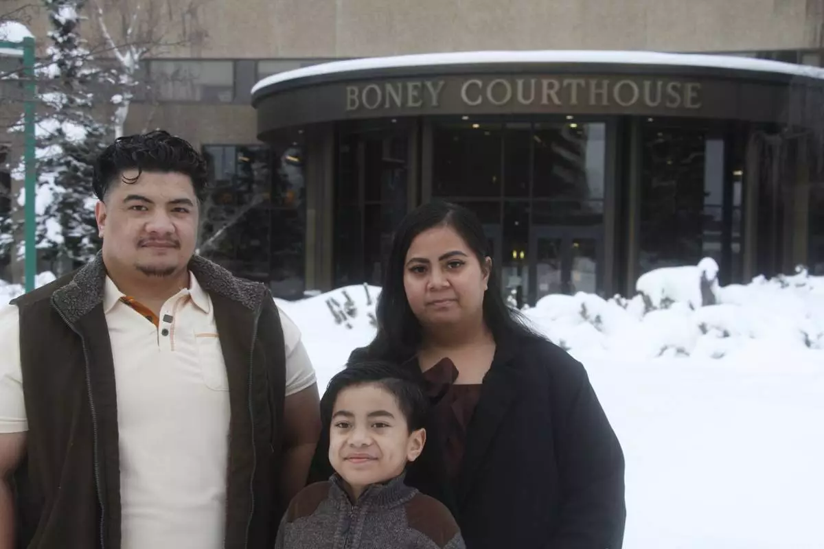 Michael Pese, left, his wife, Tupe Smith, and their son Maximus pose for a photo outside the Boney Courthouse in Anchorage, Alaska, Thursday, Jan. 15, 2026, ahead of the Alaska Court of Appeals hearing a challenge to the voter fraud case brought against her by the state. (AP Photo/Mark Thiessen)