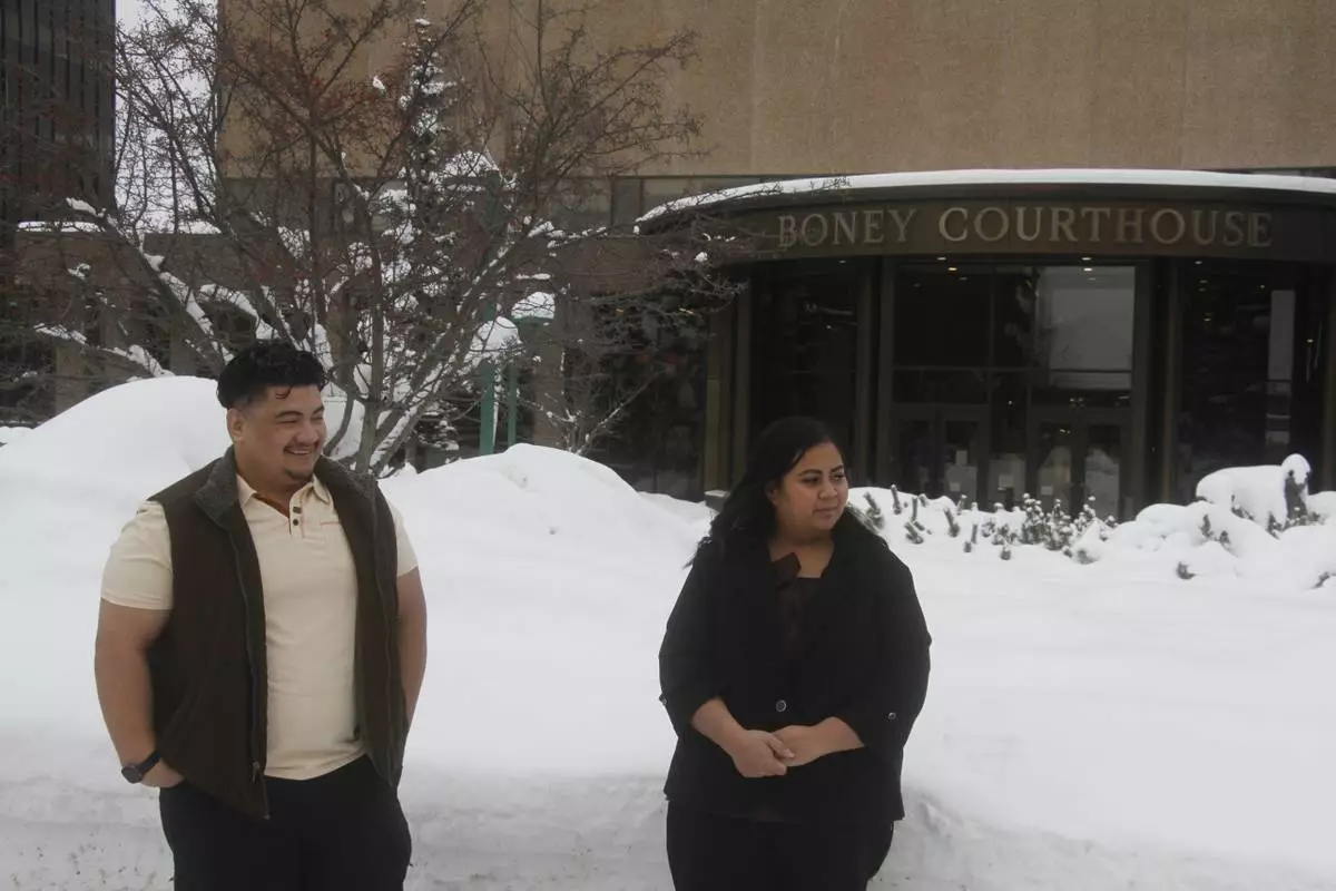 Michael Pese and his wife, Tupe Smith, stand outside the Boney Courthouse in Anchorage, Alaska, Thursday, Jan. 15, 2026, ahead of the Alaska Court of Appeals hearing a challenge to the voter fraud case brought against her by the state. (AP Photo/Mark Thiessen)