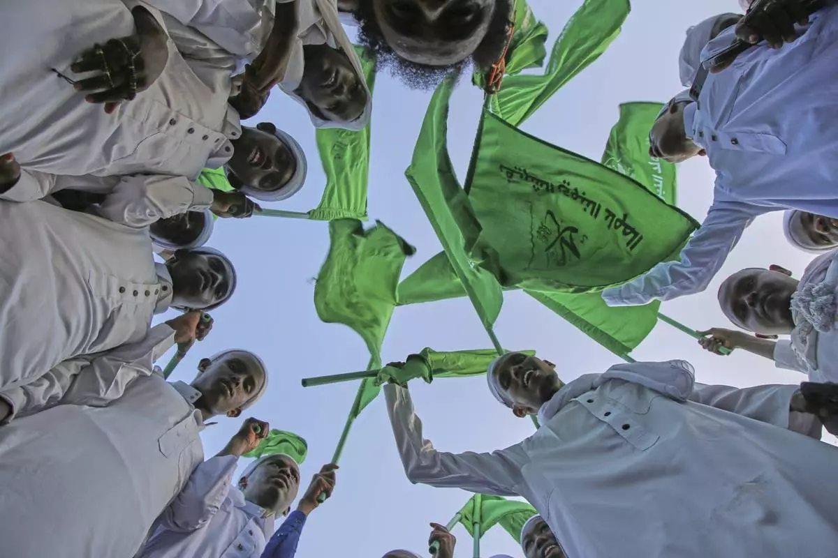 Residents raise green flags as they gather to celebrate Mawlid al-Nabi, the birthday of Prophet Muhammad, in Mogadishu, Somalia, Thursday, Sept. 4, 2025. (AP Photo/Farah Abdi Warsameh)
