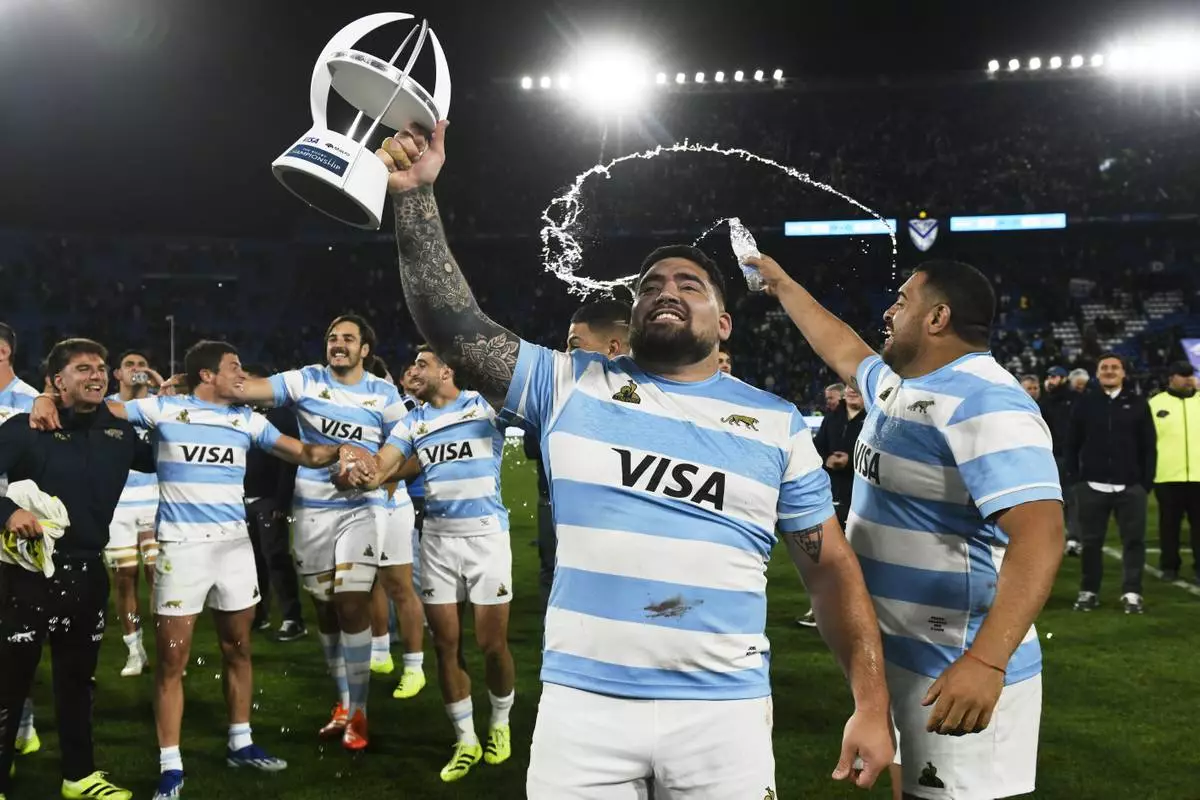 Argentina's Los Pumas players celebrate winning a rugby championship match against New Zealand's All Blacks in Buenos Aires, Argentina, Saturday, Aug. 23, 2025. (AP Photo/Gustavo Garello)