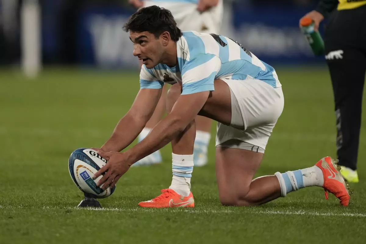 Argentina's Los Pumas Santiago Carreras prepares to kick a penalty against New Zealand's All Blacks during a rugby championship match in Buenos Aires, Argentina, Saturday, Aug. 23, 2025. (AP Photo/Gustavo Garello)