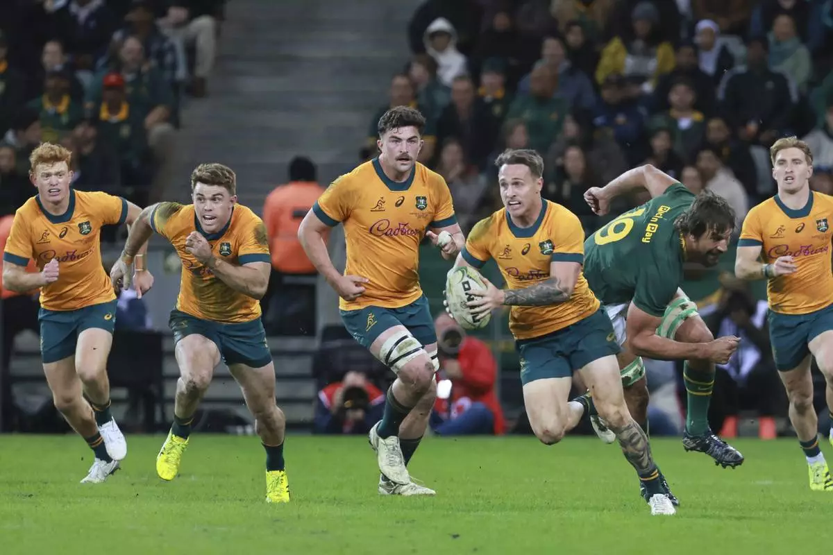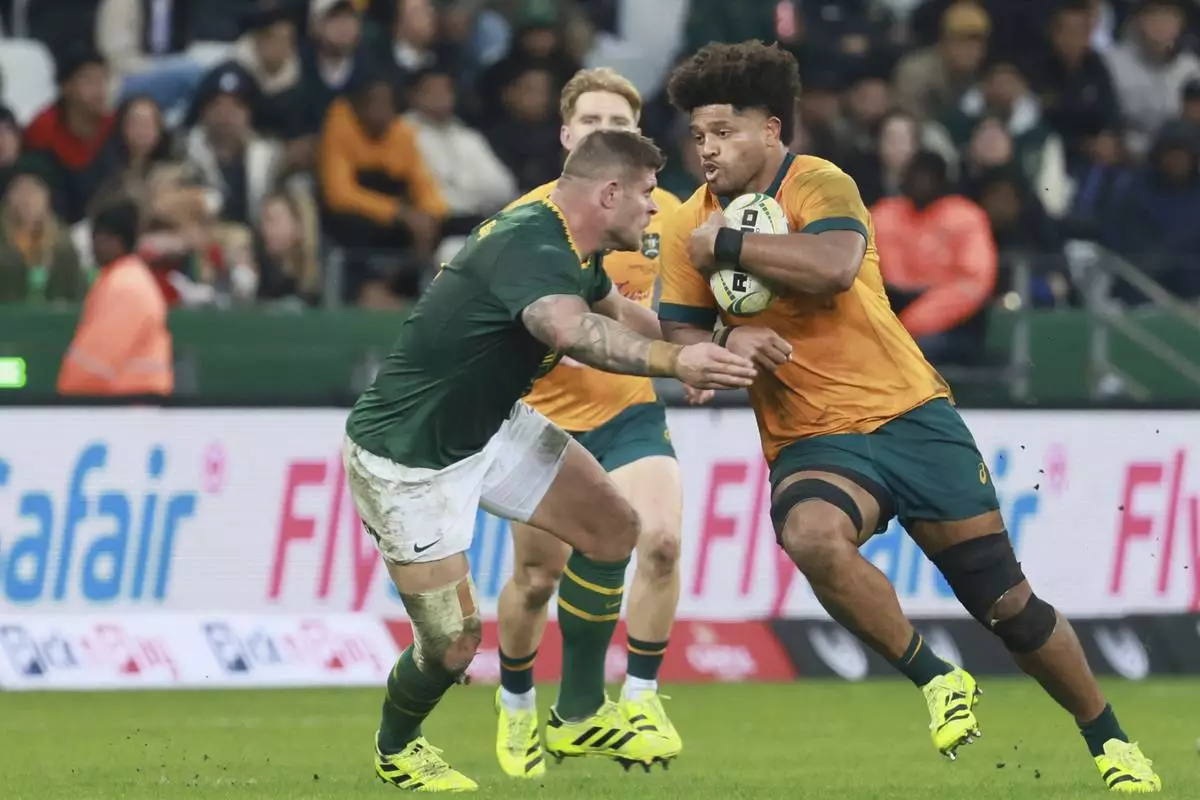 Australia's Corey Toole, front, breaks away from South Africa's Eben Etzebeth during a rugby championship test match between South Africa and Australia, at Cape Town stadium in Cape Town, South Africa, Saturday, Aug. 23, 2025. (AP Photo/Halden Krog)