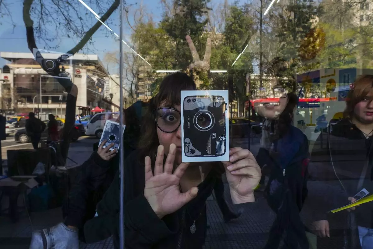 A student looks through the lens hole of a paper camera while visiting an exhibit at the Gabriela Mistral gallery in Santiago, Chile, Thursday, Sept. 4, 2025. (AP Photo/Esteban Felix)