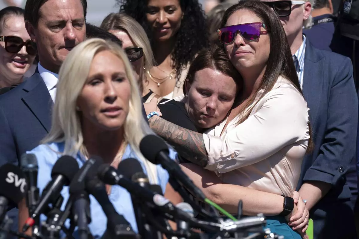 Jena-Lisa Jones, center, hugs Haley Robson, right, as Rep. Marjorie Taylor Greene, R-Ga., left, speaks during a news conference at the U.S. Capitol, Wednesday, Sept. 3, 2025, in Washington. (AP Photo/Jose Luis Magana)