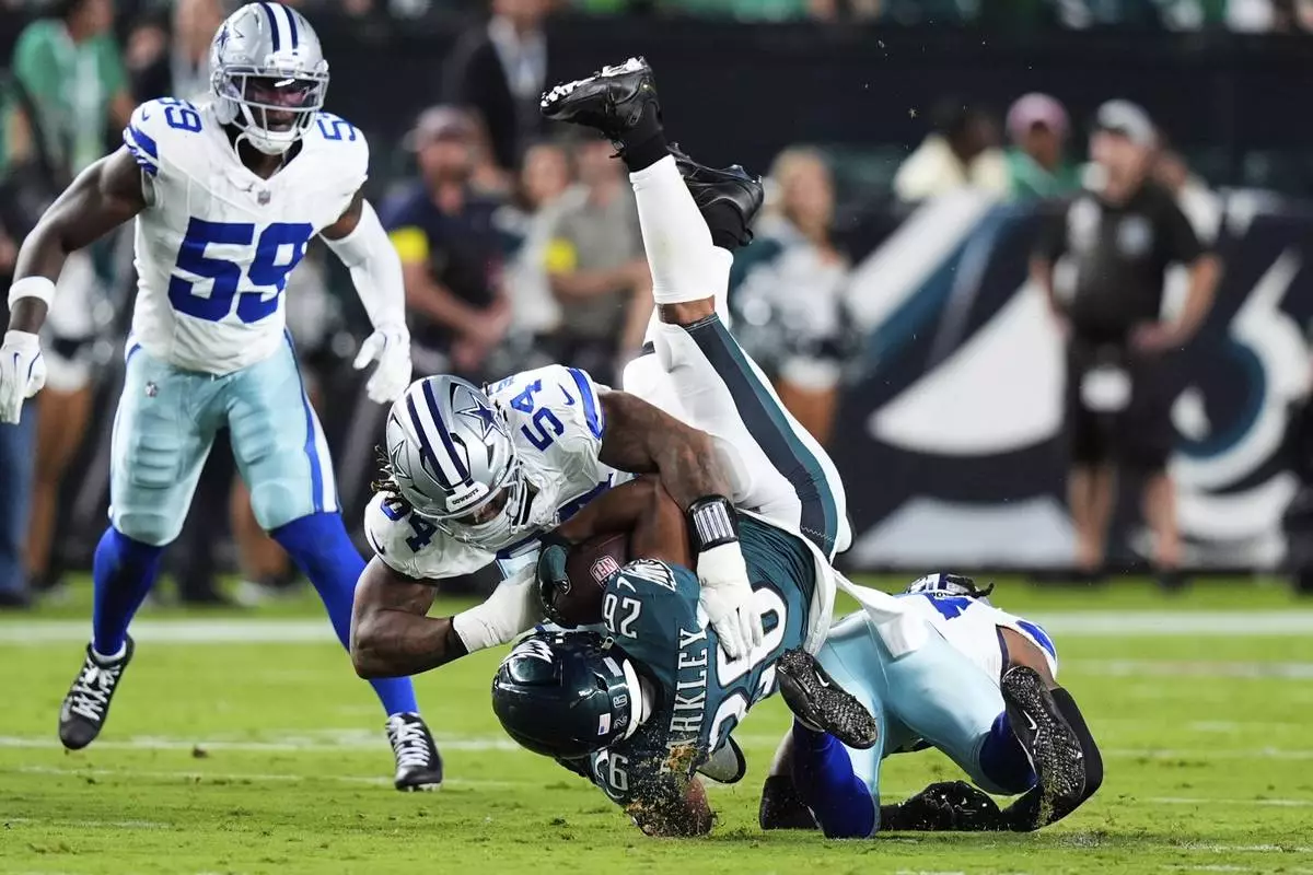 Philadelphia Eagles running back Saquon Barkley (26) is stopped after a gain by Dallas Cowboys' Sam Williams, top, and Malik Hooker, bottom, in the first half of an NFL football game Thursday, Sept. 4, 2025, in Philadelphia.(AP Photo/Chris Szagola)