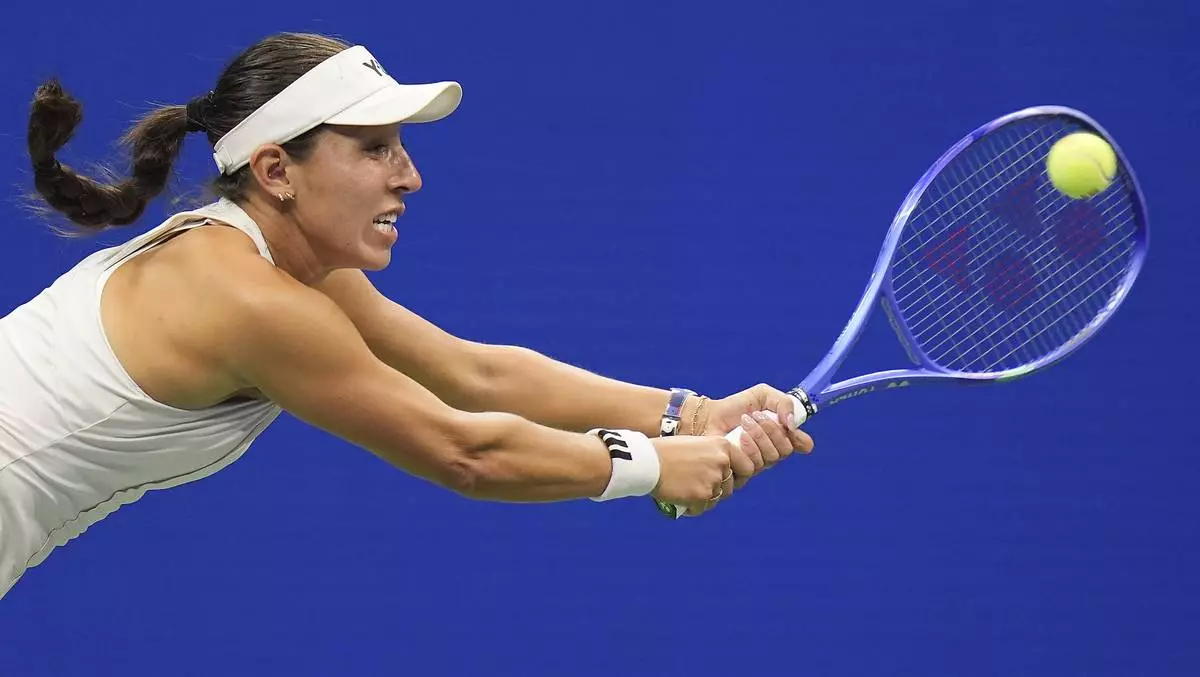 Jessica Pegula, of the United States, returns a shot to Aryna Sabalenka, of Belarus, during the women's singles semifinals of the U.S. Open tennis championships, Thursday, Sept. 4, 2025, in New York. (AP Photo/Seth Wenig)