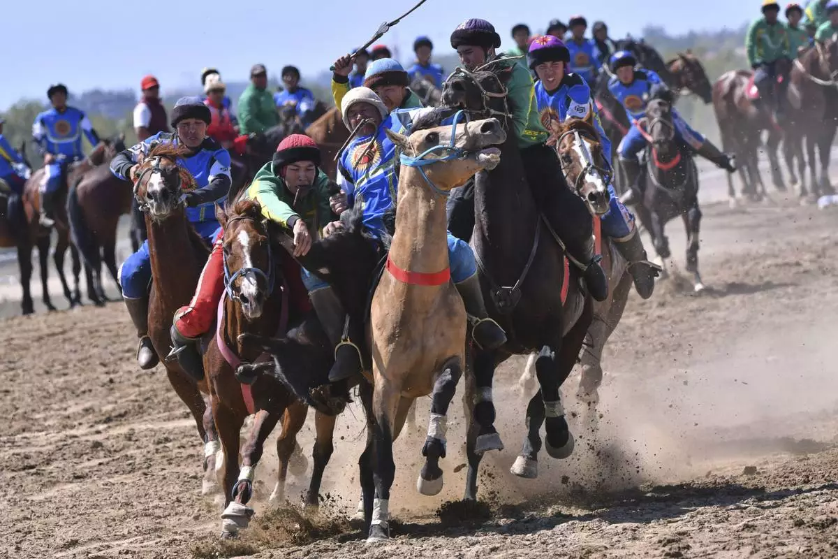 Kyrgyz horse riders compete during a kok boru, also called ulak tartysh, a traditional game in which players on horseback manoeuvre with a goat's carcass and score by putting it into the opponents' goal at the 25th Kok Boru President's Cup near Cholpon-Ata, 204km (127,5 miles) southeast of Bishkek, in the Issyk-Kul Region of Kyrgyzstan, Thursday, Sept. 4, 2025. (AP Photo/Vladimir Voronin)