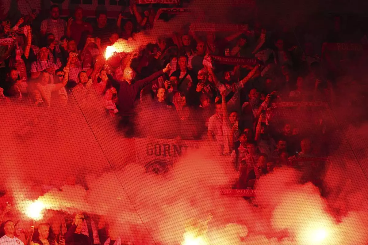 Poland fans light torches during a World Cup qualifying soccer match between the Netherlands and Poland in Rotterdam, Netherlands, Thursday, Sept. 4, 2025. (AP Photo/Peter Dejong)
