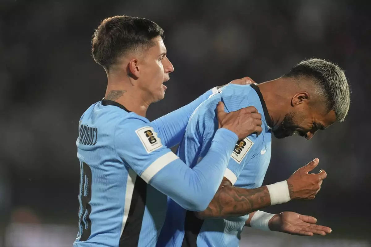 Uruguay's Rodrigo Aguirre, left, celebrates after scoring the opening goal against Peru uring a World Cup 2026 qualifying soccer match in Montevideo, Uruguay, Thursday, Sept. 4, 2025. (AP Photo/Matilde Campodonico)