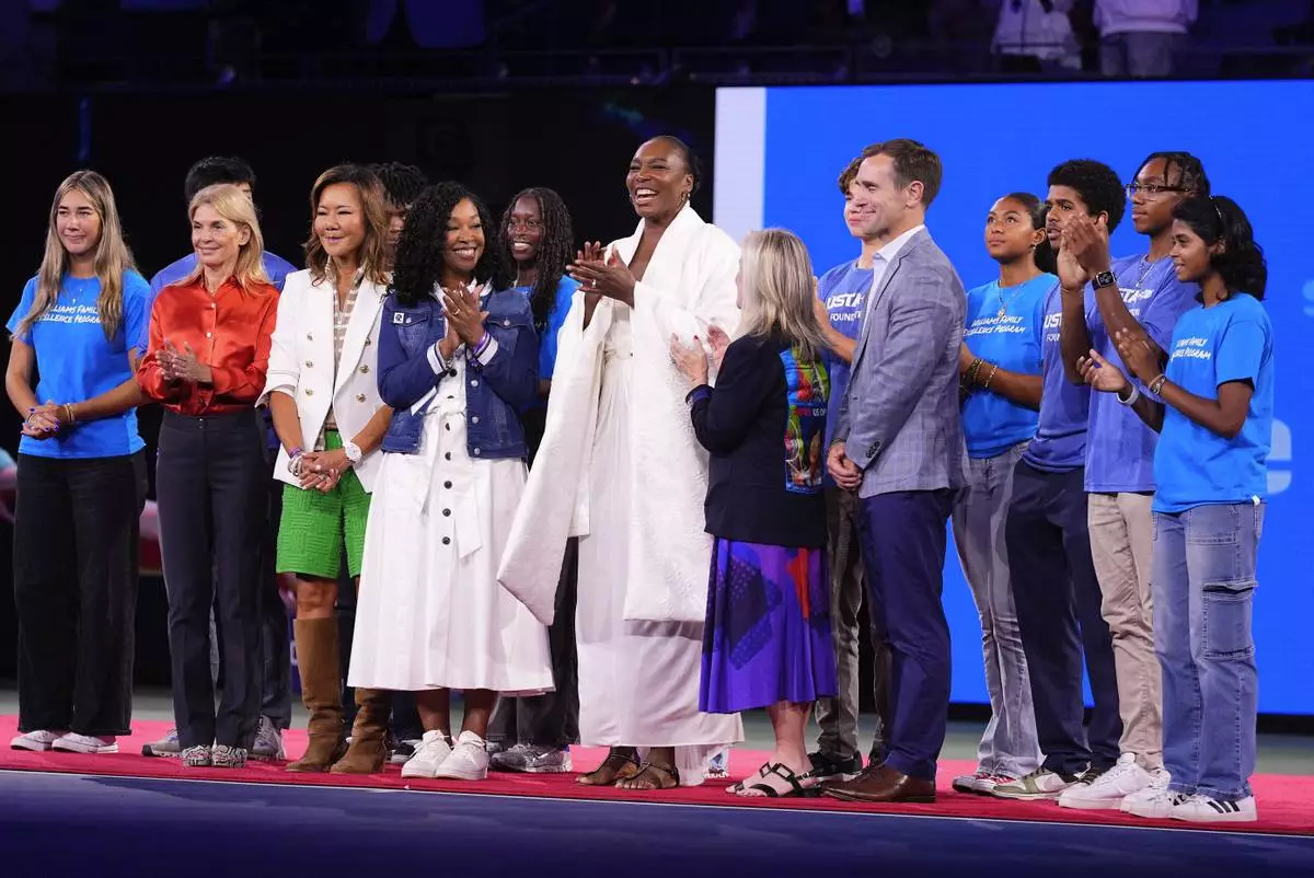 Venus Williams, center, stands on the court with Shonda Rhimes, fourth from left, and US Open tournament director Stacey Allaster, right center, during a ceremony at Arthur Ashe Stadium between matches during the women's singles semifinals of the U.S. Open tennis championships, Thursday, Sept. 4, 2025, in New York. (AP Photo/Yuki Iwamura)