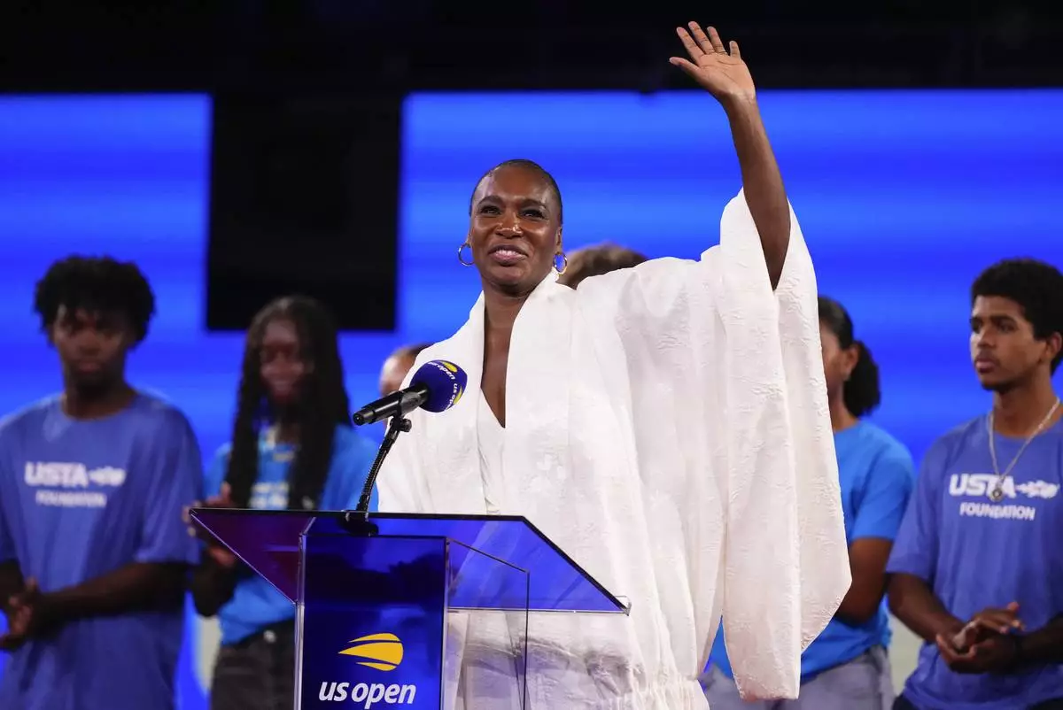 Venus Williams speaks during a ceremony at Arthur Ashe Stadium between matches during the women's singles semifinals of the U.S. Open tennis championships, Thursday, Sept. 4, 2025, in New York. (AP Photo/Yuki Iwamura)
