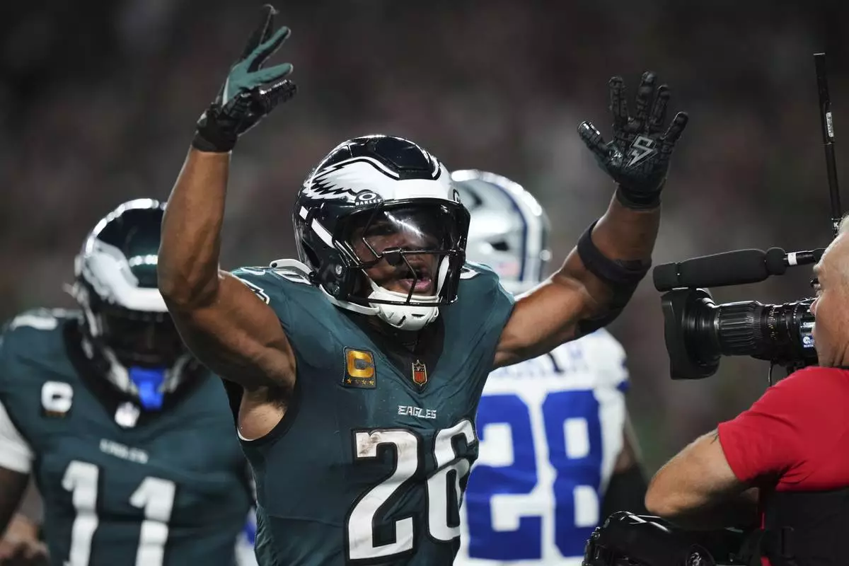 Philadelphia Eagles' Saquon Barkley celebrates after scoring a touchdown in the first half of an NFL football game against the Dallas Cowboys Thursday, Sept. 4, 2025, in Philadelphia. (AP Photo/Matt Slocum)