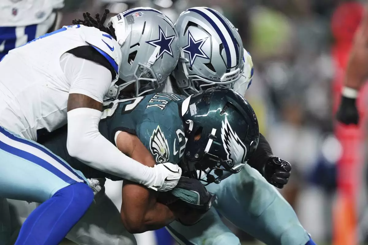 Philadelphia Eagles running back Saquon Barkley gets past Dallas Cowboys defenders as Barkley scores a touchdown in the first half of an NFL football game Thursday, Sept. 4, 2025, in Philadelphia. (AP Photo/Matt Slocum)