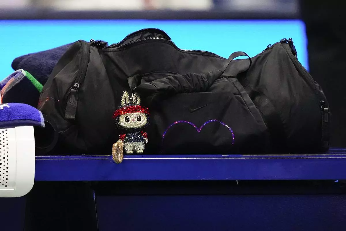 A Labubu doll sits on the bench of Naomi Osaka, of Japan, during play between Osaka and Amanda Anisimova, of the United States, during the women's singles semifinals of the U.S. Open tennis championships, Thursday, Sept. 4, 2025, in New York. (AP Photo/Yuki Iwamura)
