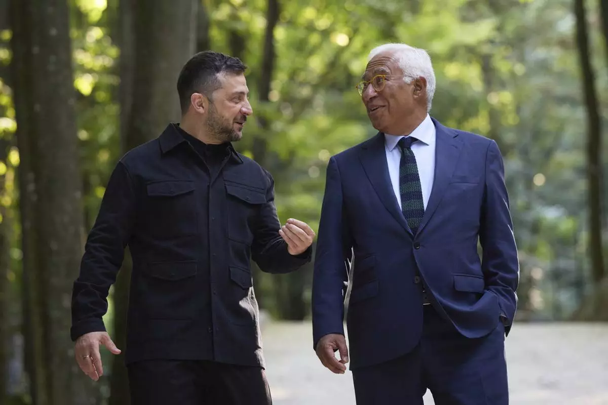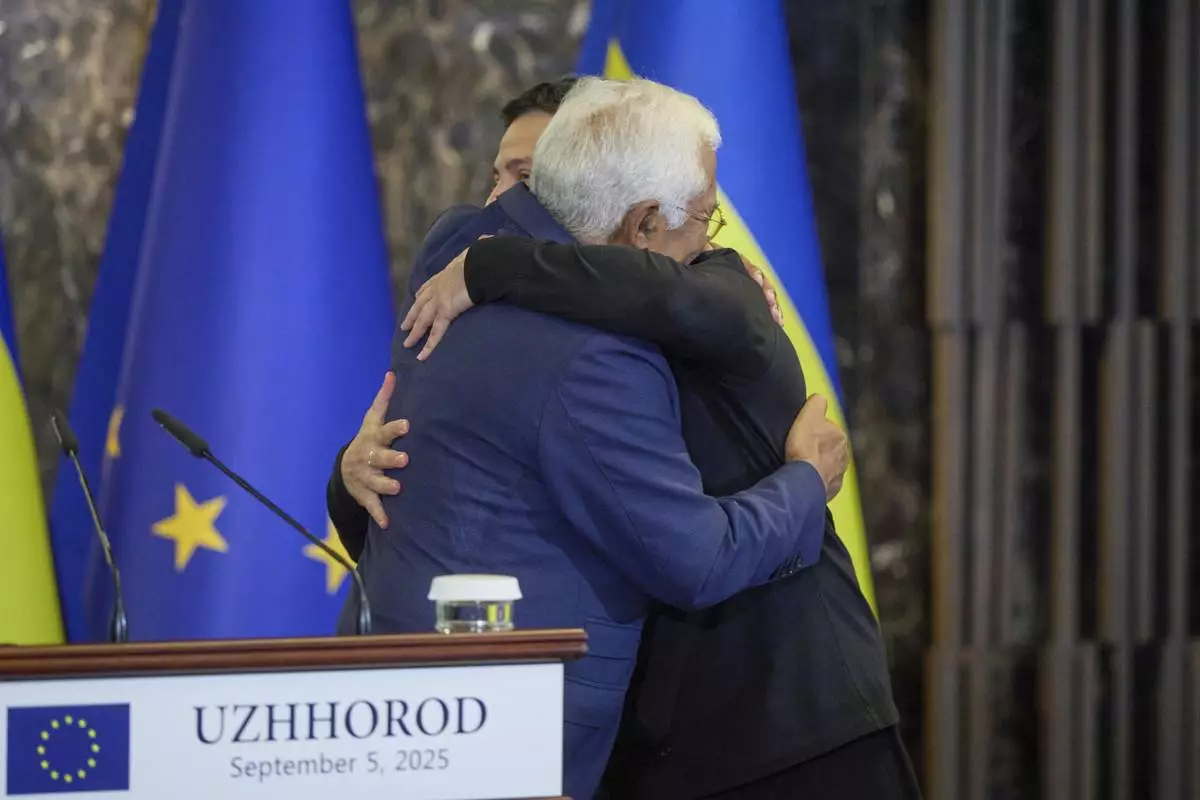 In this photo provided by the Ukrainian Presidential Press Office, Ukrainian President Volodymyr Zelenskyy, left, and European Council President Antonio Costa talk in Uzhhorod, Ukraine, Friday, Sept. 5 2025. (Ukrainian Presidential Press Office via AP)
