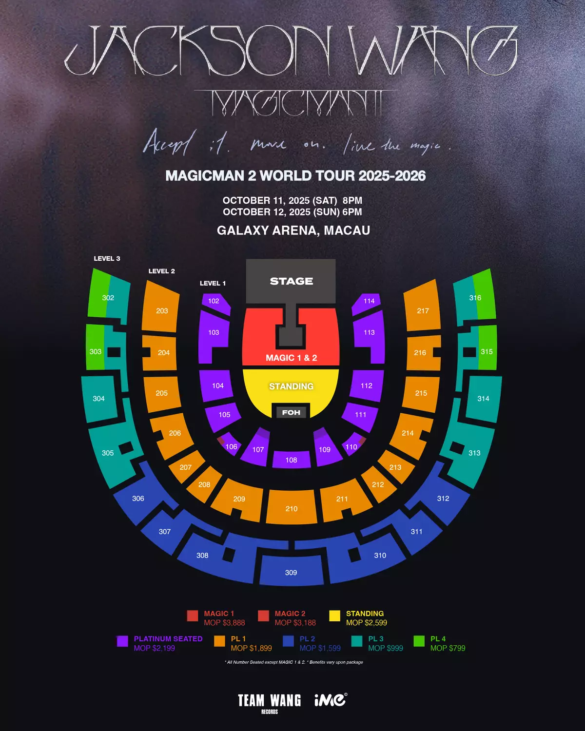 | Ticket prices | MOP: Magic 1 Package $3,888 Magic 2 Package $3,188 Standing $2,599 Platinum Seated $2,199 CAT 1 $1,899 CAT 2 $1,599 CAT 3 $999 CAT 4 $799 *Actual transaction currency determined by relevant platforms |