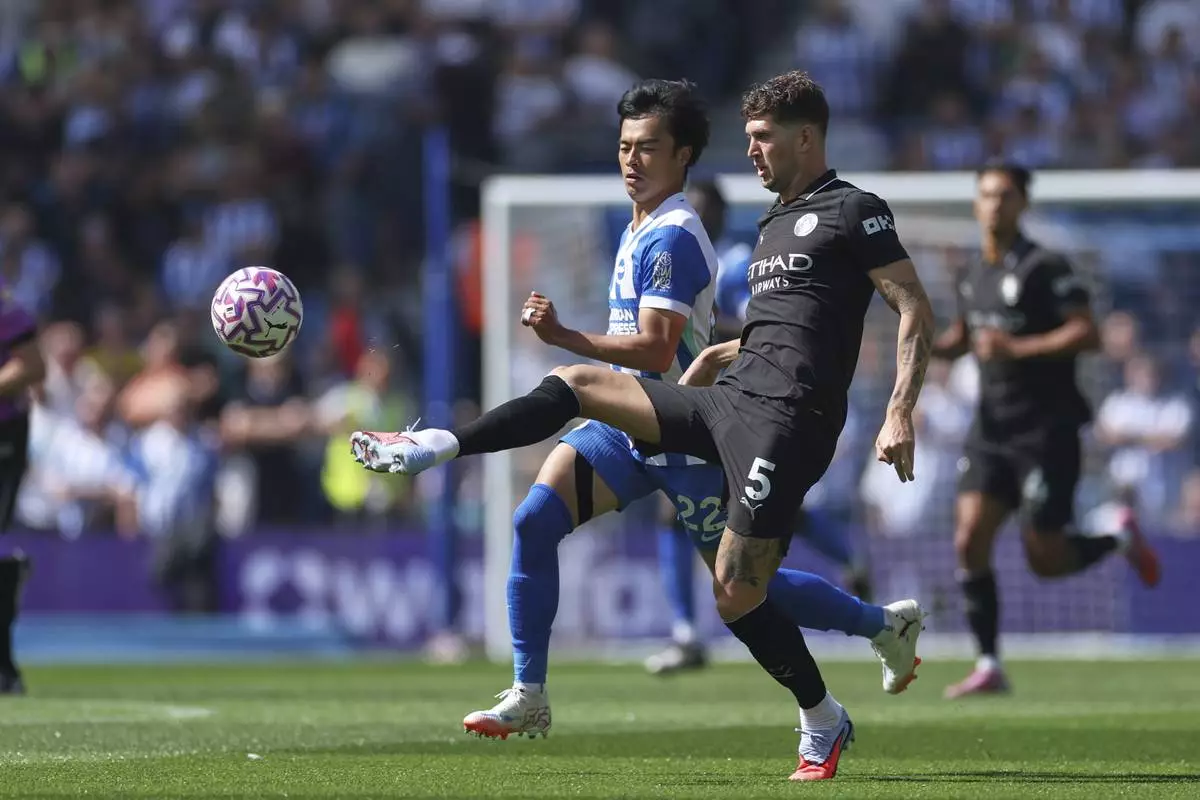 Brighton's Kaoru Mitoma, centre, challenges for the ball with Manchester City's John Stones during the English Premier League soccer match between Brighton and Hove Albion and Manchester City at the Falmer stadium in Brighton, England, Sunday, Aug. 31, 2025. (AP Photo/Ian Walton)