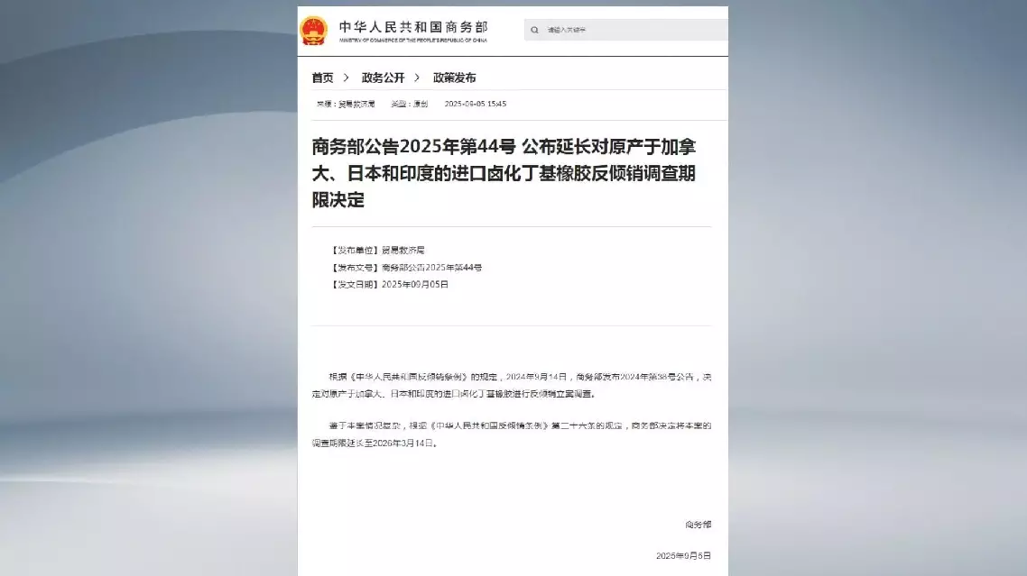 China's Ministry of Commerce announced on Friday that it will extend the duration of an anti-dumping investigation into halogenated butyl rubber imports from Canada, Japan and India.