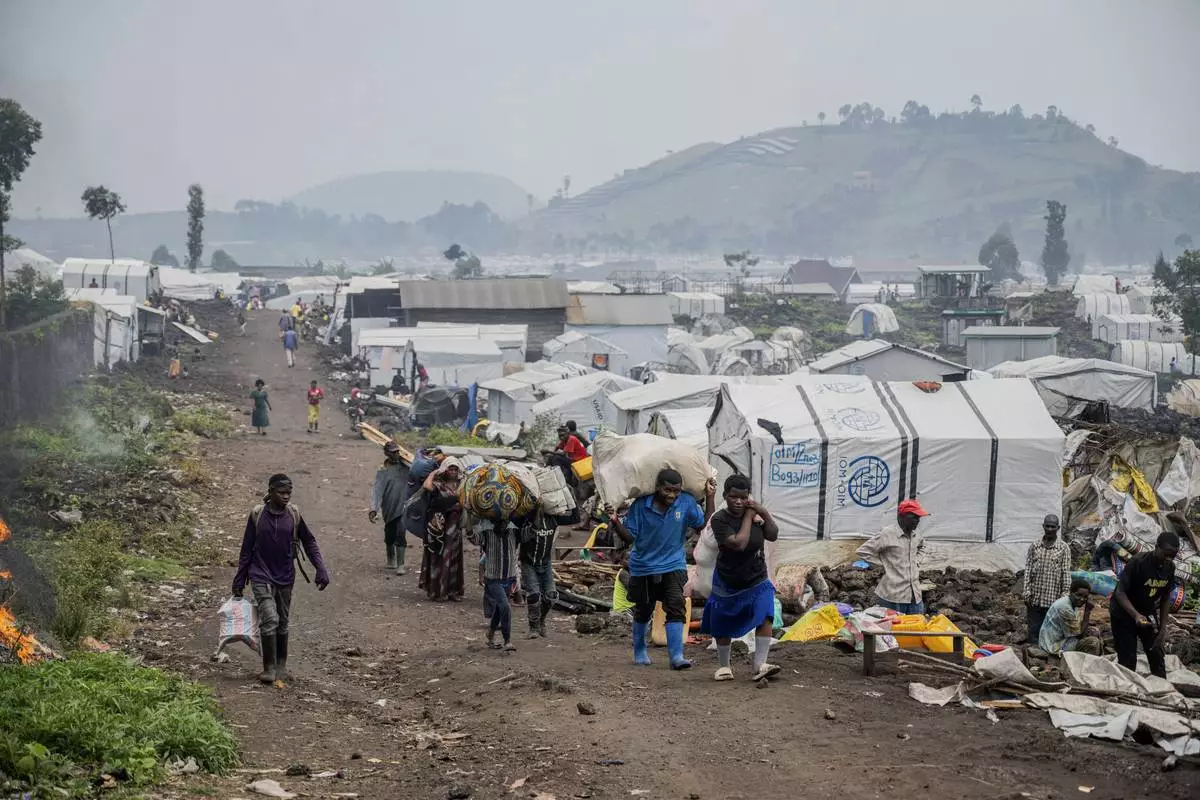 FILE - People who were displaced by the fighting between M23 rebels and government soldiers leave their camp following an instruction by M23 rebels in Goma, Democratic Republic of the Congo, Feb. 11, 2025. (AP Photo/Moses Sawasawa, File)