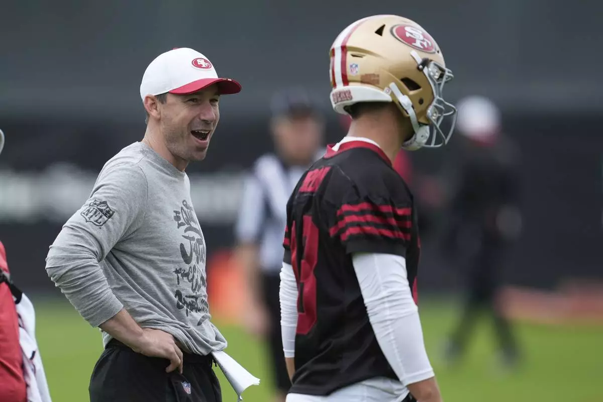 FILE - San Francisco 49ers quarterback Brock Purdy, right, talks with offensive coordinator Klay Kubiak, left, during practice at the team's NFL football training camp July 24, 2025, in Santa Clara, Calif. (AP Photo/Jeff Chiu, File)