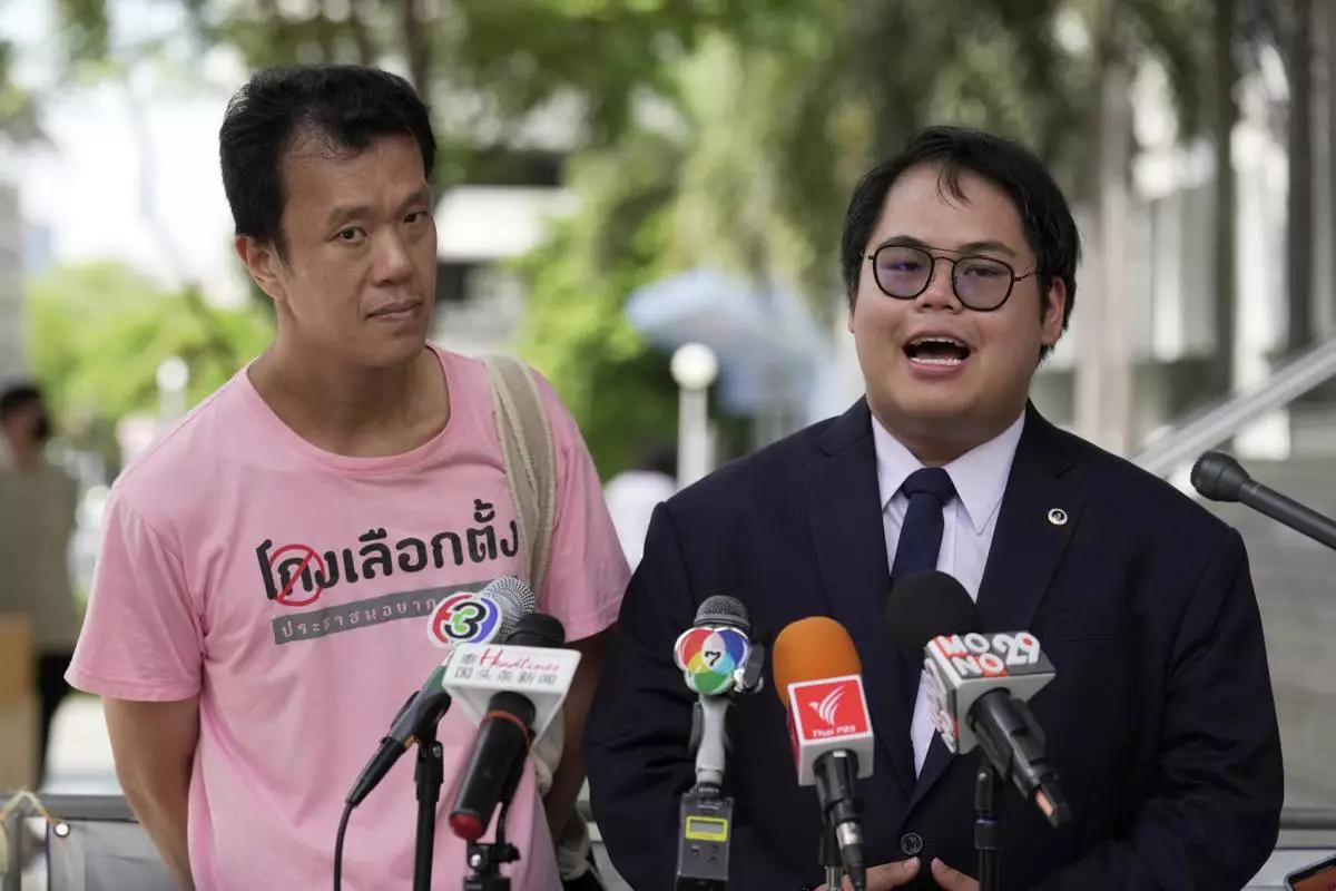 FILE - Student activist Bunkueanun Paothong, right, with activist Ekachai Hongkangwan talks to reporters before leaving a criminal court in Bangkok, Thailand, Wednesday, June 28, 2023. (AP Photo/Sakchai Lalit, file)
