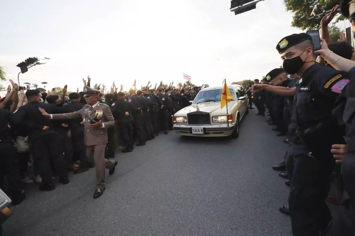 FILE - A vehicle with members of the Thai royal family onboard passes through a road where anti-government protesters gathered outside the Government House in Bangkok, Thailand on Oct. 14, 2020. (AP Photo/Sakchai Lalit, File)