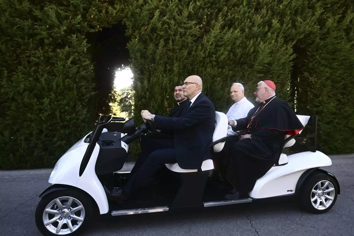 Pope Leo XIV, second from right, sits on an electric car during a tour for the inauguration of the "Borgo Laudato Si'" Advanced Training Center, at the papal summer residence in Castel Gandolfo, Italy, Friday Sept. 5, 2025. (Filippo Monteforte, Pool via AP)
