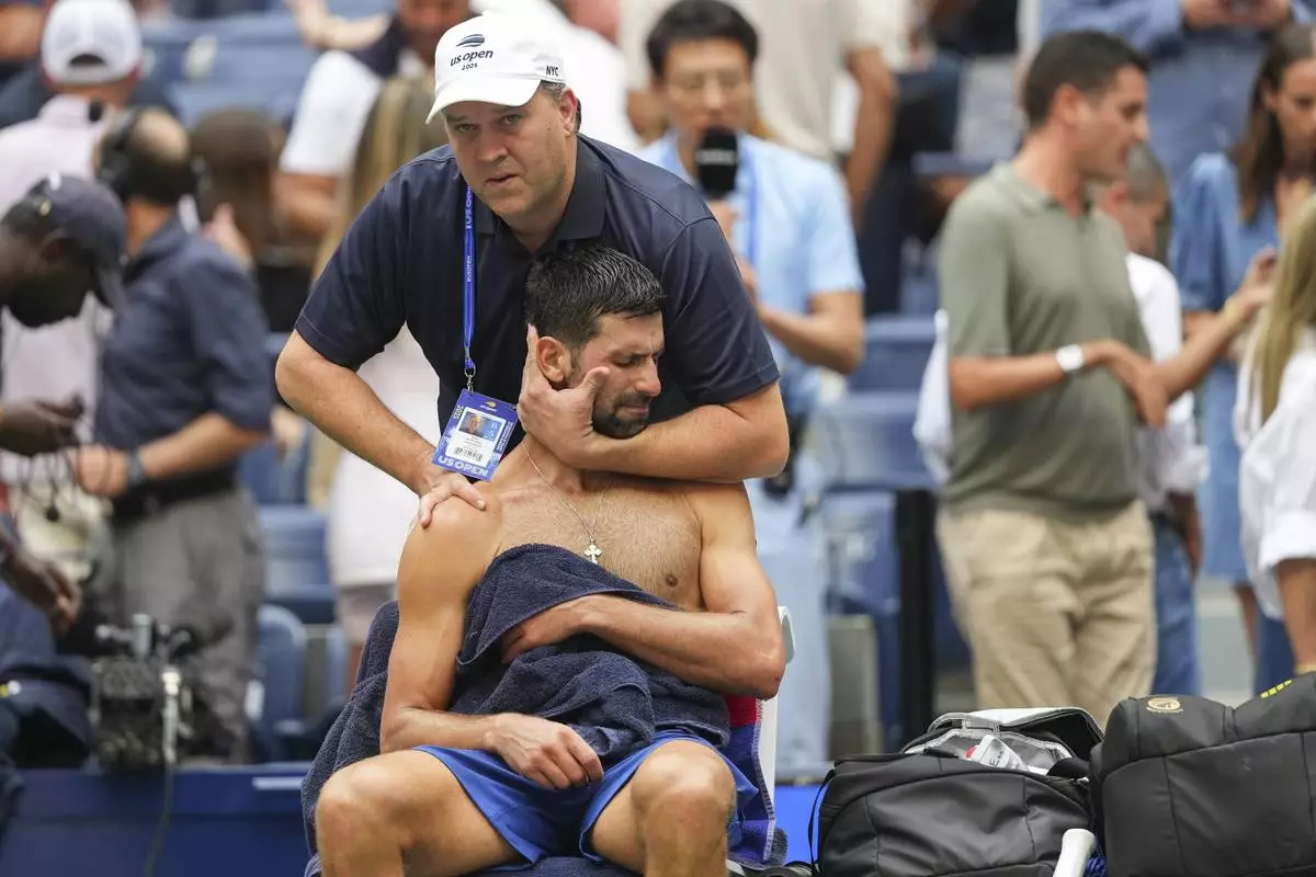 Athletic trainer Clay Sniteman works on Novak Djokovic, of Serbia, between sets against Carlos Alcaraz, of Spain, during the men's singles semifinals of the U.S. Open tennis championships, Friday, Sept. 5, 2025, in New York. (AP Photo/Kirsty Wigglesworth)