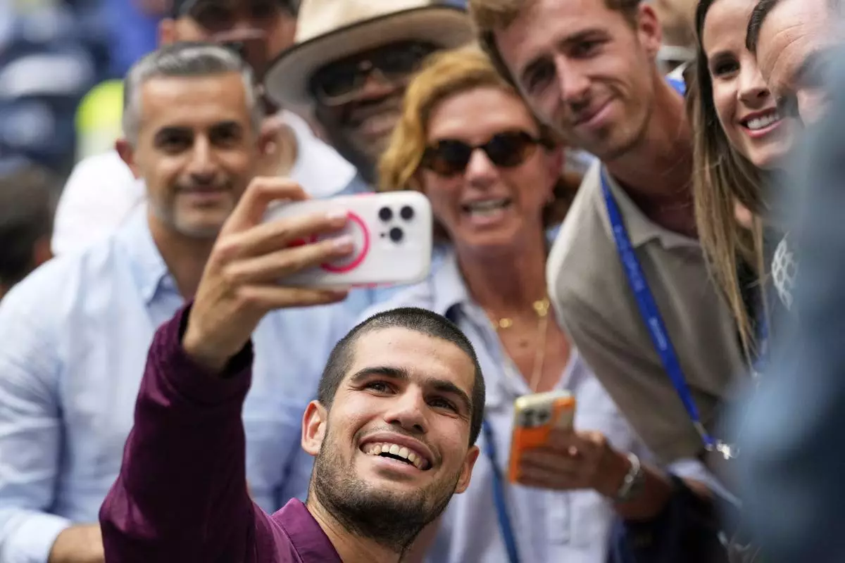 Carlos Alcaraz, of Spain, takes a seflie after defeating Novak Djokovic, of Serbia, during the men's singles semifinals of the U.S. Open tennis championships, Friday, Sept. 5, 2025, in New York. (AP Photo/Seth Wenig)