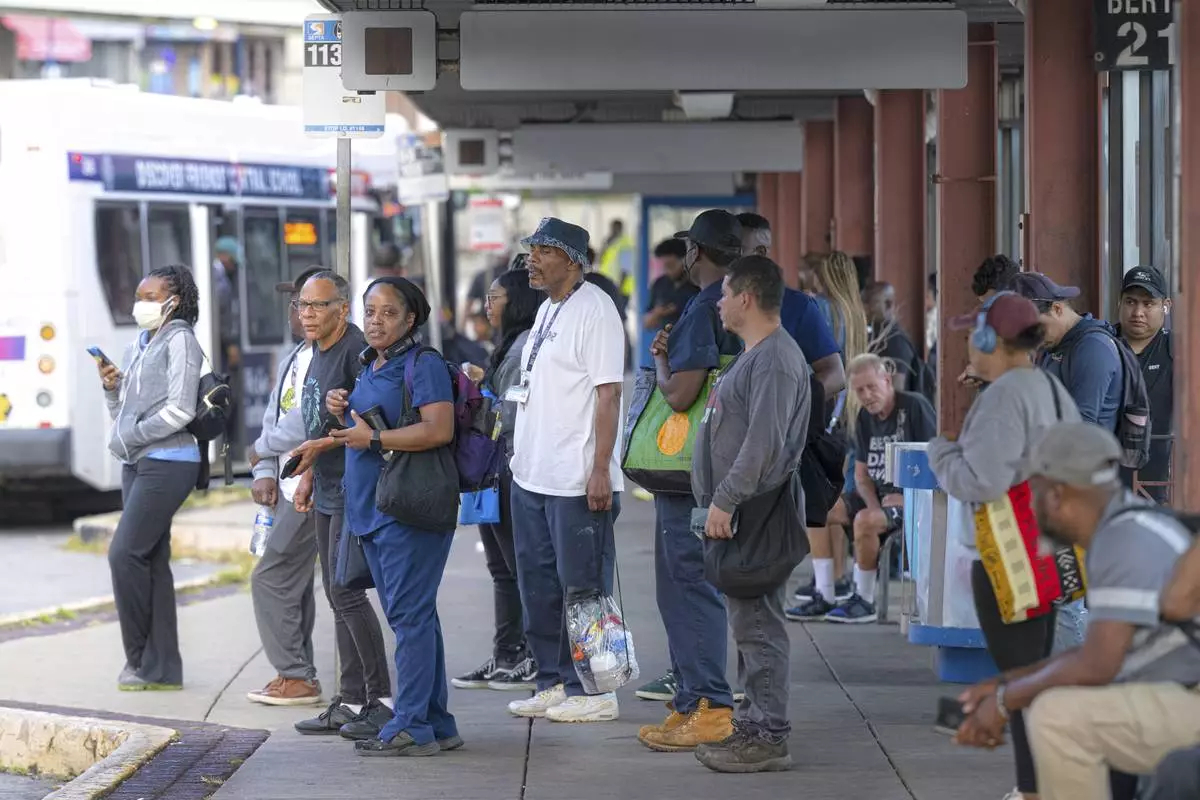 Commuters wait to board a SEPTA bus during the early morning hours at the 69th Street Bus Station in Upper Darby, Pa., Monday, Aug. 25, 2025. (Jose F. Moreno/The Philadelphia Inquirer via AP)