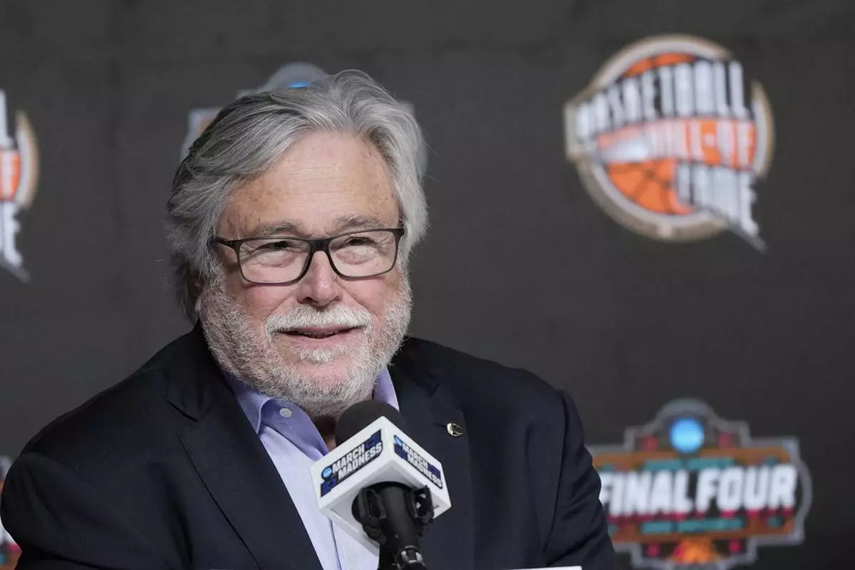 FILE - Micky Arison speaks during a Naismith Hall Fame Class of 2025 inductee news conference at the Final Four of the NCAA college basketball tournament, April 5, 2025, in San Antonio. (AP Photo/David J. Phillip)