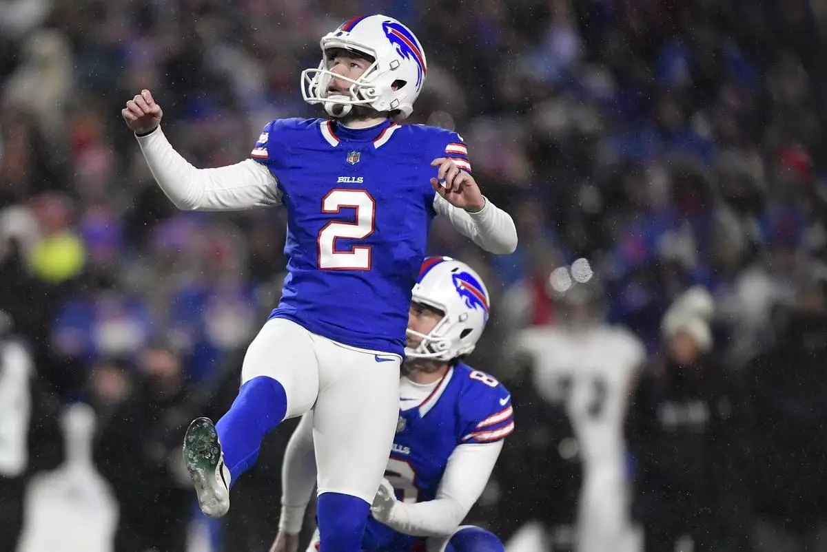 FILE - Buffalo Bills placekicker Tyler Bass (2) boots a field goal against the Baltimore Ravens during the fourth quarter of an NFL football divisional playoff game Jan. 19, 2025, in Orchard Park, N.Y. (AP Photo/Adrian Kraus, File)
