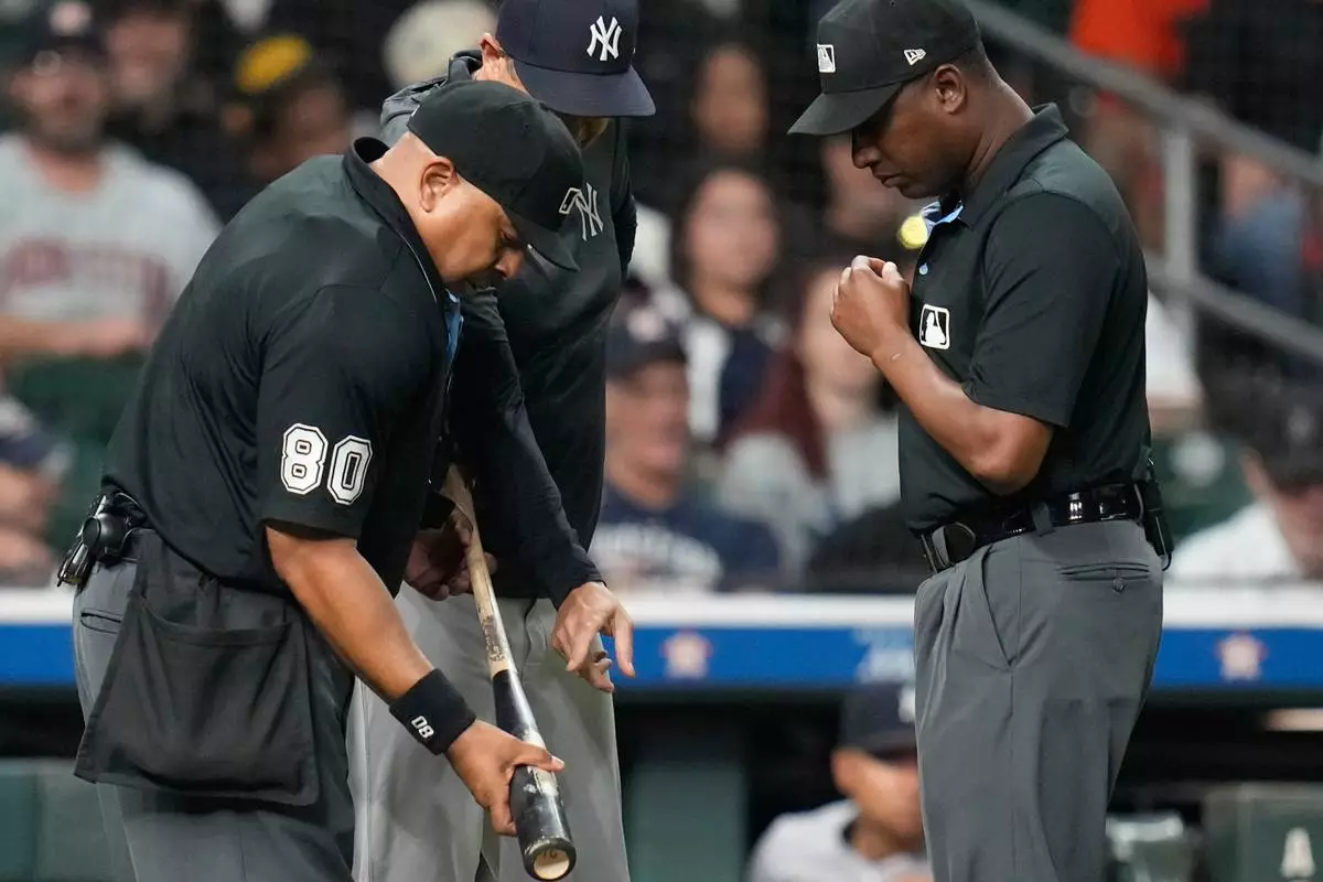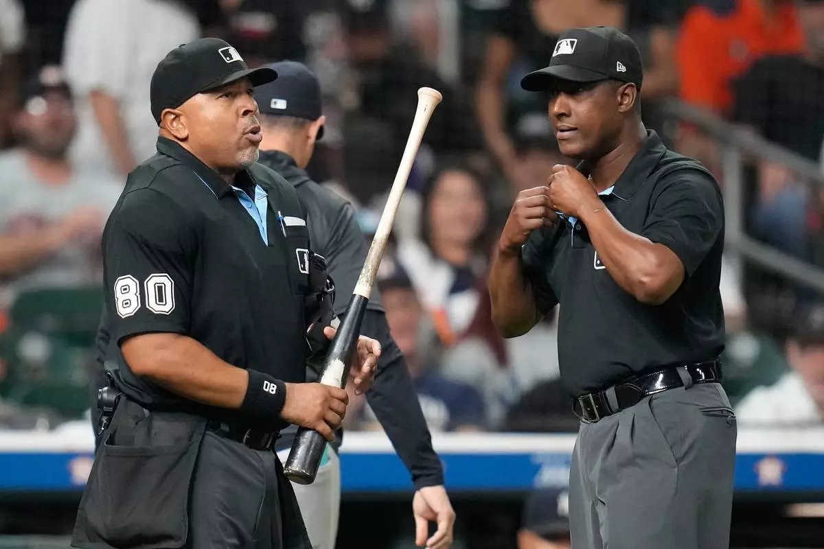 Home plate umpire Adrian Johnson, left, holds Houston Astros' Taylor Trammell's bat as he and Ramon De Jesus, right, were asked by the New York Yankees to challenge the bat during the ninth inning of a baseball game Thursday, Sept. 4, 2025, in Houston. (AP Photo/Karen Warren)