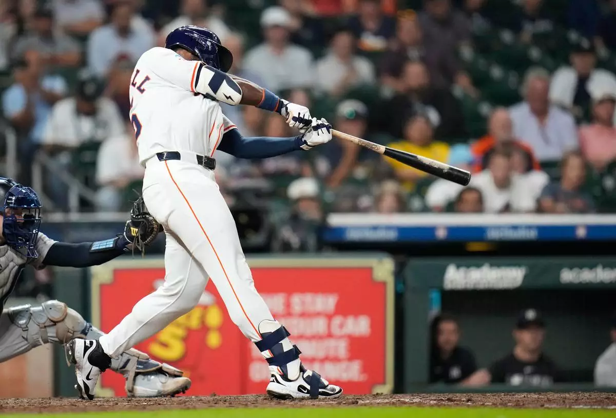 Houston Astros' Taylor Trammell hits a double off of New York Yankees relief pitcher David Bednar during the ninth inning of a baseball game Thursday, Sept. 4, 2025, in Houston. (AP Photo/Karen Warren)