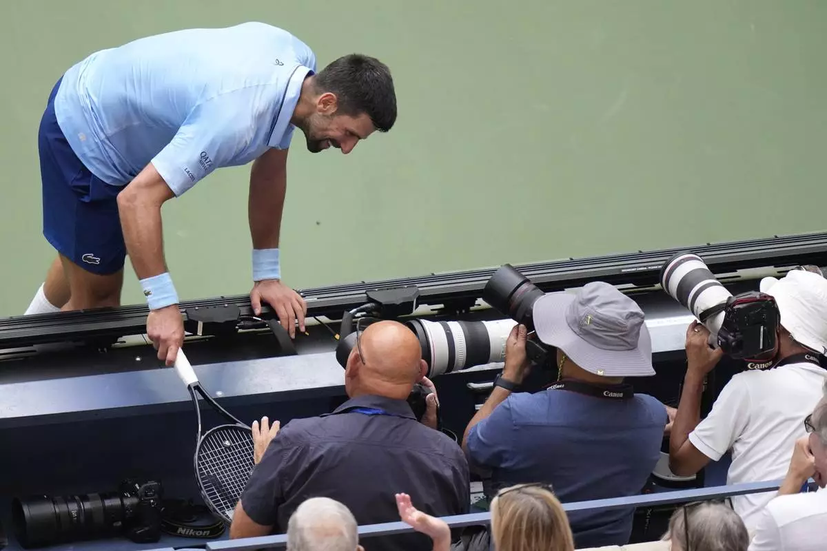 Novak Djokovic, of Serbia, runs into the photgraphers box against Carlos Alcaraz, of Spain, during the men's singles semifinals of the U.S. Open tennis championships, Friday, Sept. 5, 2025, in New York. (AP Photo/Frank Franklin)