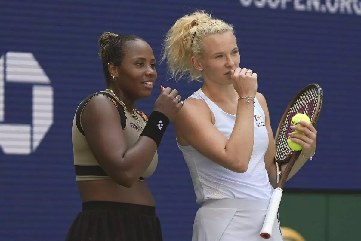 Taylor Townsend, of the United States, and Katerina Siniakova, of the Czech Republic, address the crowd after losing to Erin Routliffe, of New Zealand, and Gabriela Dabrowski, of Canada, in the women's doubles final of the U.S. Open tennis championships, Friday, Sept. 5, 2025, in New York. (AP Photo/Seth Wenig)