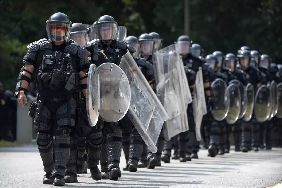 During a training exercise involving local and federal law enforcement organized by the U.S. Capitol Police, police officers wearing protective equipment march at the U.S. Secret Service James J. Rowley Training Center Friday, Sept. 5, 2025, in Laurel, Md. (AP Photo/Mark Schiefelbein)