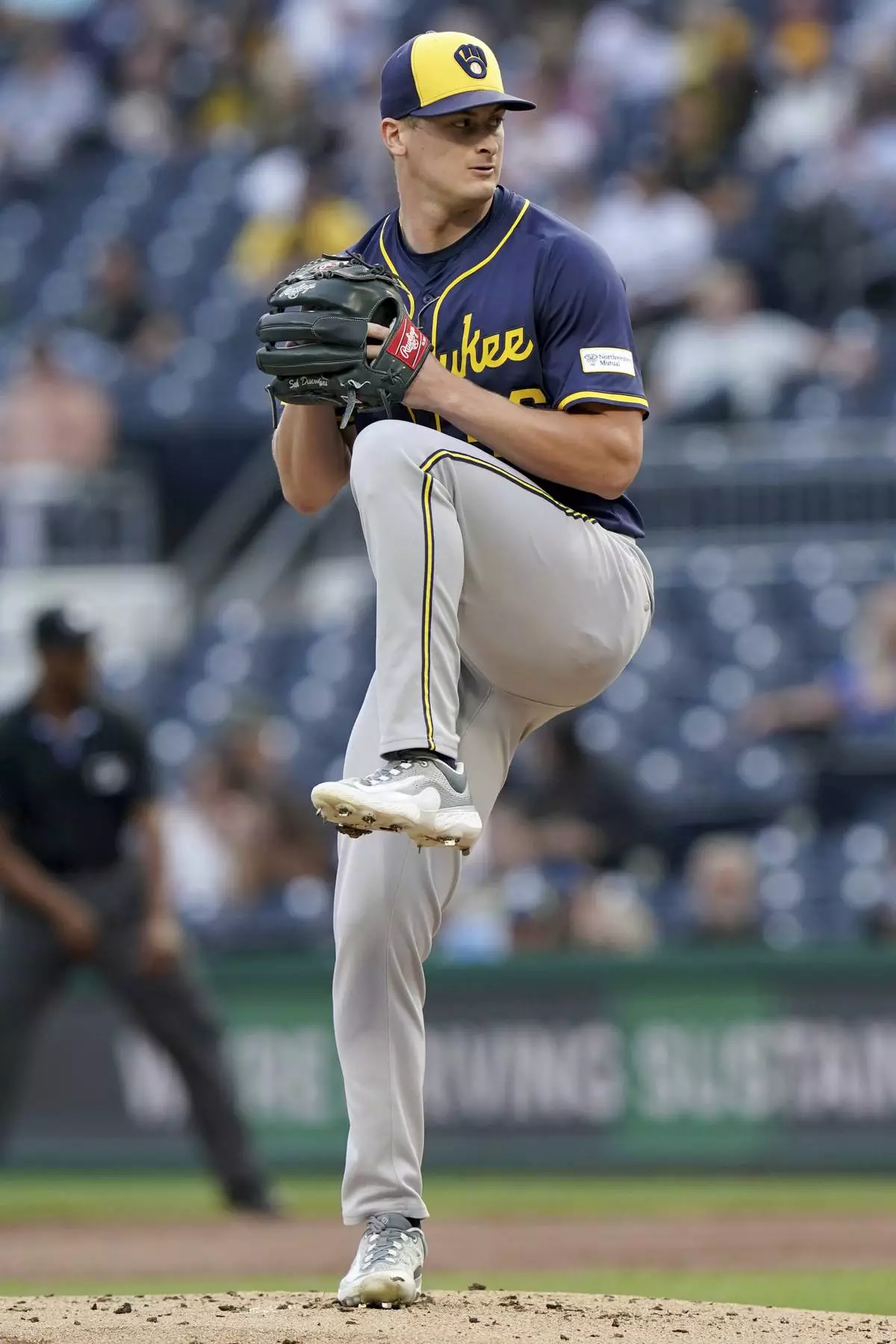 Milwaukee Brewers pitcher Quinn Priester winds up to deliver during the first inning of a baseball game against the Pittsburgh Pirates, Friday, Sept. 5, 2025, in Pittsburgh. (AP Photo/Matt Freed)