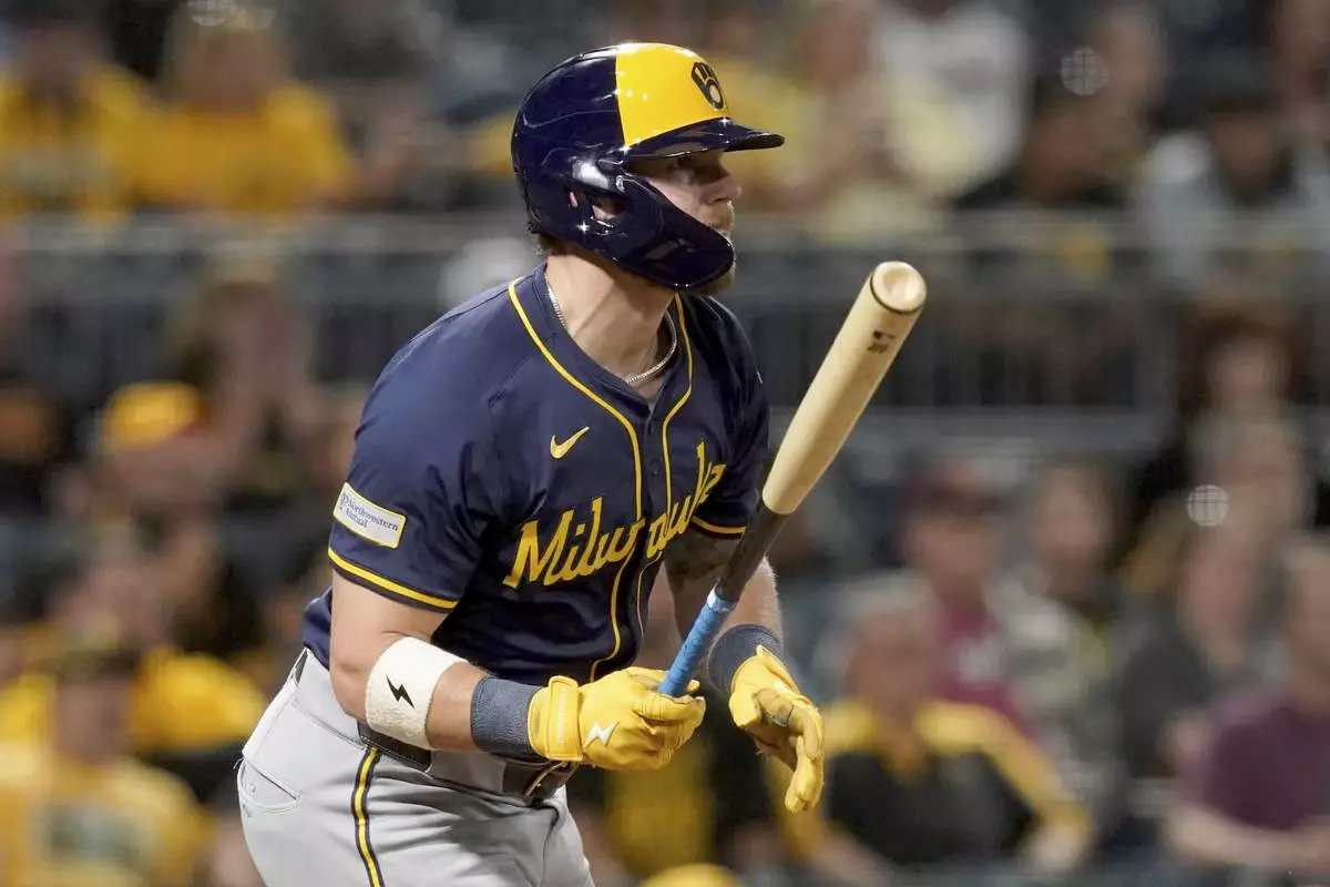 Milwaukee Brewers' Jake Bauers watches his RBI single during the sixth inning of a baseball game against the Pittsburgh Pirates, Friday, Sept. 5, 2025, in Pittsburgh. (AP Photo/Matt Freed)