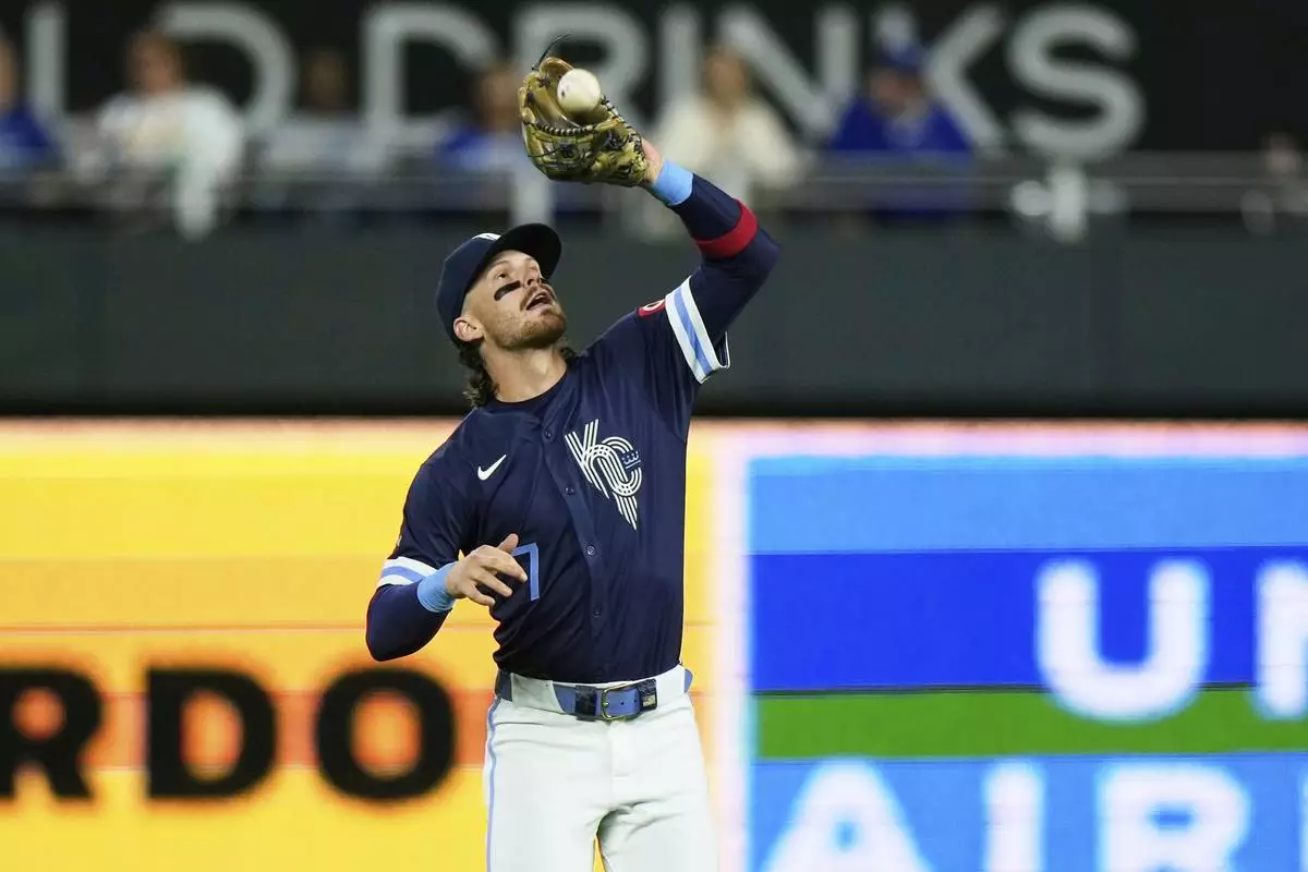 Kansas City Royals shortstop Bobby Witt Jr. catches a fly ball for the out on Minnesota Twins' Trevor Larnach during the fifth inning of a baseball game Friday, Sept. 5, 2025, in Kansas City, Mo. (AP Photo/Charlie Riedel)