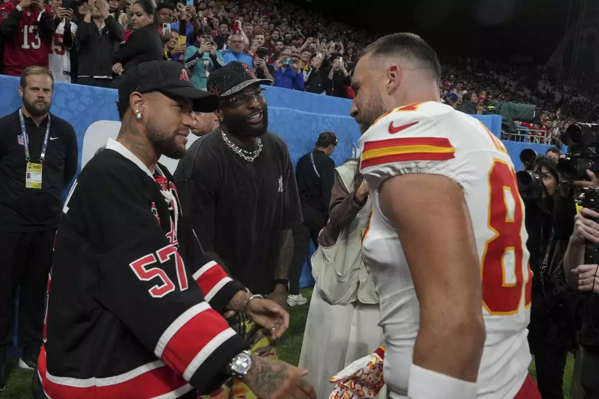 Brazilian soccer player, Neymar Jr. greets Kansas City Chiefs tight end Travis Kelce during warm ups before an NFL football game between the Kansas City Chiefs and the Los Angeles Chargers, Friday, Sept. 5, 2025, in Sao Paulo. (AP Photo/Fernando Llano)