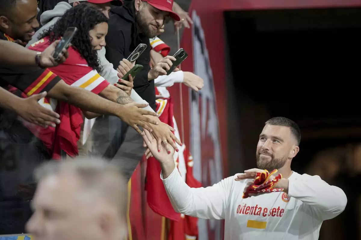 Kansas City Chiefs tight end Travis Kelce arrives an NFL football game between the Kansas City Chiefs and the Los Angeles Chargers, Friday, Sept. 5, 2025, in Sao Paulo. (AP Photo/Fernando Llano)