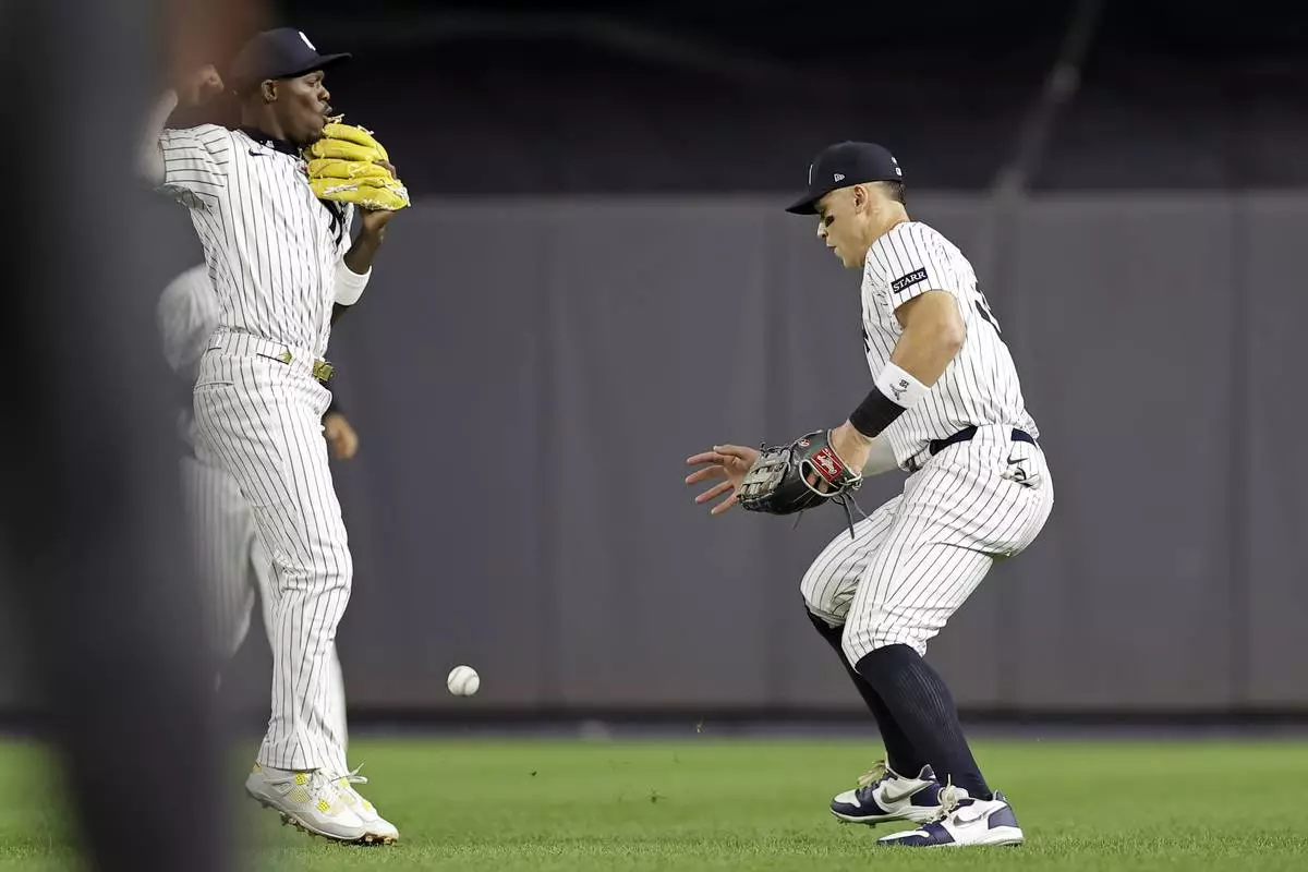 New York Yankees outfielder Aaron Judge, right and Jazz Chisholm Jr. watch a single hit by Toronto Blue Jays' Bo Bichette fall between them during the fifth inning of a baseball game Friday, Sept. 5, 2025, in New York. (AP Photo/Adam Hunger)