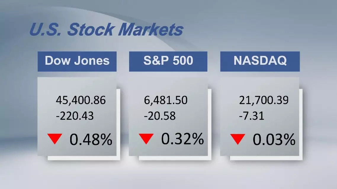 The Dow Jones Industrial Average fell 220.43 points, or 0.48 percent, to 45,400.86. The Standard and Poor's 500 declined 20.58 points, or 0.32 percent, to 6,481.5. The Nasdaq Composite Index edged down 7.31 points, or 0.03 percent, to 21,700.39.
