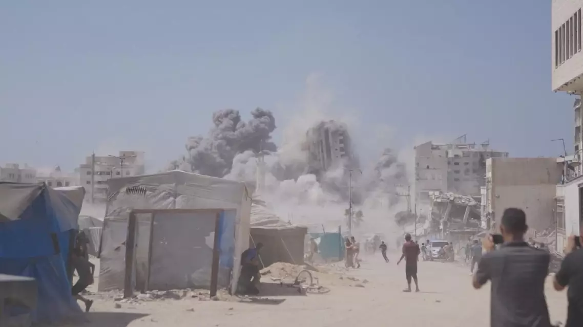The residential tower, over 10 stories tall and surrounded by several refugee camps, was hit three times and flattened to rubble. Residents had received temporary evacuation notices before the airstrike, but many left without basic supplies or their belongings, reported the correspondent.